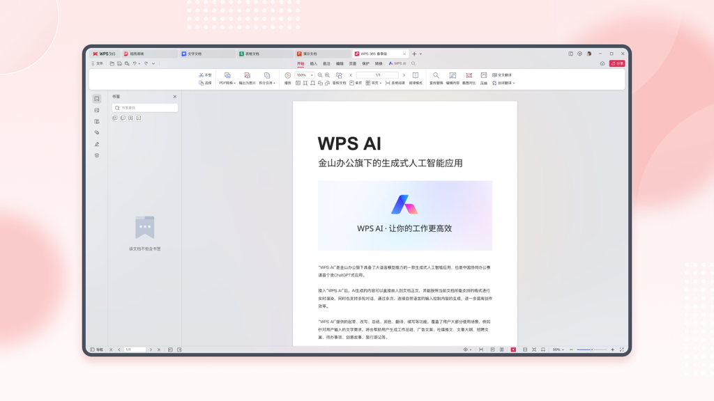WPS,重新定义办公方式。花3分钟,了解All in One 的办公方式,对你的办公效率提升有极大帮助,因高效节省下来的时间,会让你在职场上更从容、更自由。文档处理领域,进一步拓宽:文档、表格、演示、PDF的处理能力更强、效率更高;提升脑图、流程图的使用体验,让思维工具更好用。