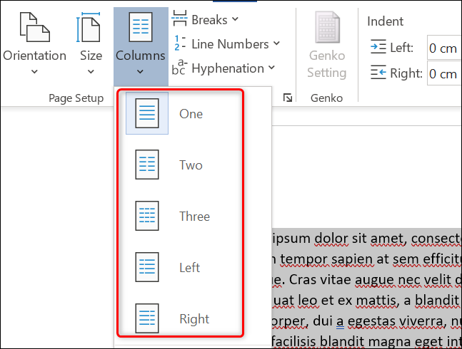 在新的“列”窗口中,您将看到多个选项,例如“一个”、“两个”、“三个”等。单击代表您希望生成的精确列数的数值。如果您之前选择了任何内容,您的配置设置将仅应用于这些部分。