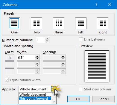使用“应用到”下拉菜单将列格式限制为仅选定的文本。但是,它可以应用于整个文档。当设置满足您的需要时,单击“确定”以实施更改。就这样!