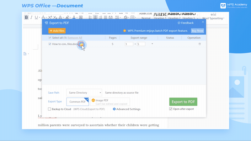 通常,在设置“导出类型”时,我们可以选择“普通PDF”,但如果您不希望文件被随意修改和复制,则可以支付WPS溢价,将文档转换为“图像PDF”。