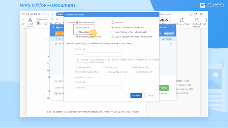 例如,如果我们想在导出的PDF中保留原始文档的注释和超链接,请选择“注释 和超链接”,然后单击“确认” 和“导出为PDF” 按钮。然后我们就可以查看转换后的PDF文件中的注释和超链接。