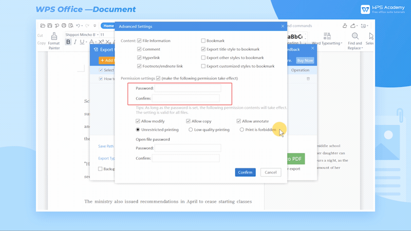例如,假设您不希望其他人复制文件信息。此时,您可以设置密码,取消勾选“允许复制” 来限制操作权限。